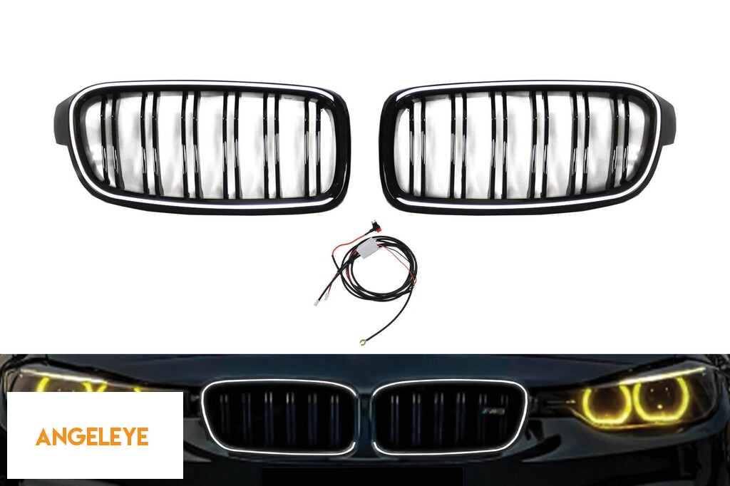 Grile rinichi iluminate stil Iconic Glow cu fante duble potrivite pentru BMW Seria 3 F30, F31 2012-2019, negru lucios