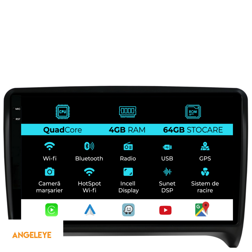Sistem de operare: Android 13 Procesor: Quad-core 1.5Ghz Memorie RAM: 4GB Stocare interna (ROM): 64GB Dimensiune Display: 9 Inch Rezolutie ecran: 1360x800p Bluetooth: Bluetooth pentru apeluri, descarcare agenda telefonica si redare muzica WiFi: Da (Integrat) Slot Sim 4G: Nu Conectivitate retea: Hotspot telefon, router extern, dongle 3G sau 4G, CarPlay Android Auto Microfon: Microfon integrat, cu posibilitate de conectare microfon extern Alimentare: 12V Putere audio: 4x45W Egalizator DSP: Procesor de sunet digital (DSP EQ) Compatibilitate USB SD: Compatibil cu USB de pana la 128GB, suport SD prin adaptor USB Compatibilitate aplicatii Android: Compatibil cu majoritatea aplicatiilor Android din Google Play Compatibilitate CarPlay si Android Auto: Da, compatibil cu iOS (CarPlay) si Android (Android Auto) Suport pentru limbi:a Romana, Engleza, Maghiara, Spaniola, Italiana, Germana, etc. Tip ecran: TouchScreen capacitiv, multi-touch, IPS Setari luminozitate: Da Radio RDS: Da Iesire subwoofer RCA: Da Iesire video RCA: Da, cu ajutorul unui adaptor USB Iesire audio RCA: Da GPS: Da, (Google Maps, Waze, HereWeGo) Senzori de parcare: Da (Preluare senzori de parcare cu afisaj unde este cazul) Control volan: Da (Preluare comenzi volan cu canbus sau analogic unde este cazul) Compatibilitate camera DVR: Da Compatibilitate camera marsarier: Da Manual de utilizare: Da Continut pachet: Navigatie Android Rama adaptoare Cablaj de alimentare Antena GPS Conectori RCA Cablaj pentru camera de marsarier, 2 cabluri USB Canbus (doar daca este cazul) Certificat de garantie Factura fiscala Navigatia este compatibila cu urmatoarele marci auto : Audi: TT (2006-2014)