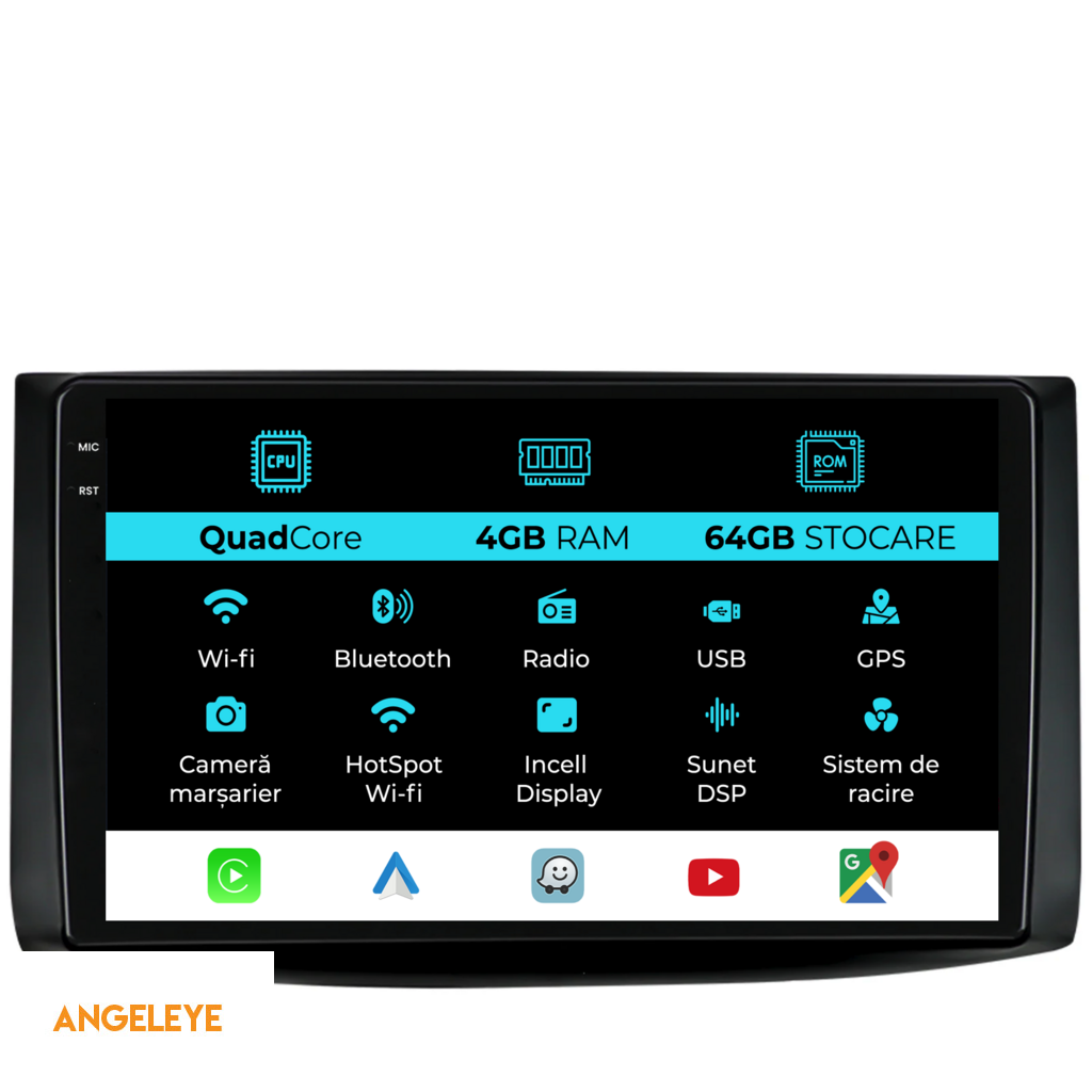 Sistem de operare: Android 13 Procesor: Quad-core 1.5Ghz Memorie RAM: 4GB Stocare interna (ROM): 64GB Dimensiune Display: 9 Inch Rezolutie ecran: 1360x800p Bluetooth: Bluetooth pentru apeluri, descarcare agenda telefonica si redare muzica WiFi: Da (Integrat) Slot Sim 4G: Nu Conectivitate retea: Hotspot telefon, router extern, dongle 3G sau 4G, CarPlay Android Auto Microfon: Microfon integrat, cu posibilitate de conectare microfon extern Alimentare: 12V Putere audio: 4x45W Egalizator DSP: Procesor de sunet digital (DSP EQ) Compatibilitate USB SD: Compatibil cu USB de pana la 128GB, suport SD prin adaptor USB Compatibilitate aplicatii Android: Compatibil cu majoritatea aplicatiilor Android din Google Play Compatibilitate CarPlay si Android Auto: Da, compatibil cu iOS (CarPlay) si Android (Android Auto) Suport pentru limbi:a Romana, Engleza, Maghiara, Spaniola, Italiana, Germana, etc. Tip ecran: TouchScreen capacitiv, multi-touch, IPS Setari luminozitate: Da Radio RDS: Da Iesire subwoofer RCA: Da Iesire video RCA: Da, cu ajutorul unui adaptor USB Iesire audio RCA: Da GPS: Da, (Google Maps, Waze, HereWeGo) Senzori de parcare: Da (Preluare senzori de parcare cu afisaj unde este cazul) Control volan: Da (Preluare comenzi volan cu canbus sau analogic unde este cazul) Compatibilitate camera DVR: Da Compatibilitate camera marsarier: Da Manual de utilizare: Da Continut pachet: Navigatie Android Rama adaptoare Cablaj de alimentare Antena GPS Conectori RCA Cablaj pentru camera de marsarier, 2 cabluri USB Canbus (doar daca este cazul) Certificat de garantie Factura fiscala Navigatia este compatibila cu urmatoarele marci auto : Chevrolet: Aveo (2002-2011)