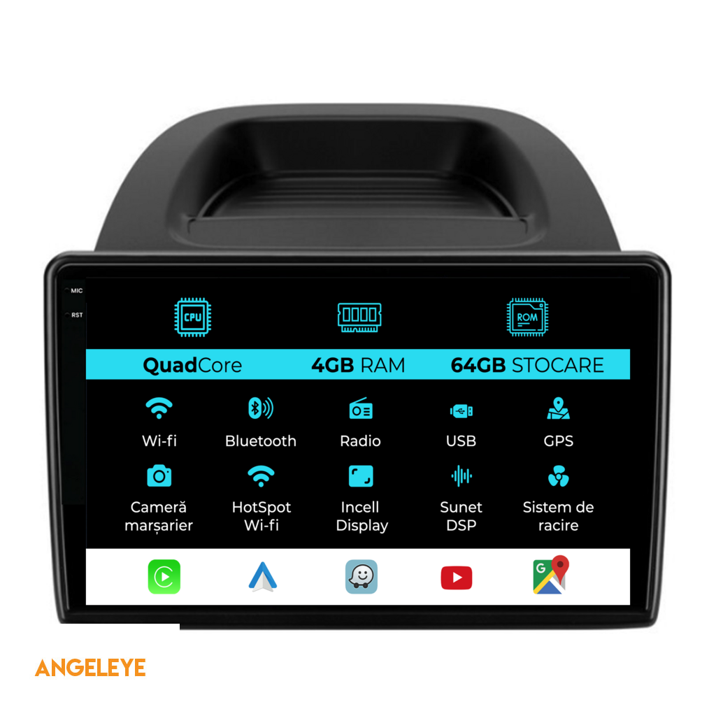 Sistem de operare: Android 13 Procesor: Quad-core 1.5Ghz Memorie RAM: 4GB Stocare interna (ROM): 64GB Dimensiune Display: 9 Inch Rezolutie ecran: 1360x800p Bluetooth: Bluetooth pentru apeluri, descarcare agenda telefonica si redare muzica WiFi: Da (Integrat) Slot Sim 4G: Nu Conectivitate retea: Hotspot telefon, router extern, dongle 3G sau 4G, CarPlay Android Auto Microfon: Microfon integrat, cu posibilitate de conectare microfon extern Alimentare: 12V Putere audio: 4x45W Egalizator DSP: Procesor de sunet digital (DSP EQ) Compatibilitate USB SD: Compatibil cu USB de pana la 128GB, suport SD prin adaptor USB Compatibilitate aplicatii Android: Compatibil cu majoritatea aplicatiilor Android din Google Play Compatibilitate CarPlay si Android Auto: Da, compatibil cu iOS (CarPlay) si Android (Android Auto) Suport pentru limbi:a Romana, Engleza, Maghiara, Spaniola, Italiana, Germana, etc. Tip ecran: TouchScreen capacitiv, multi-touch, IPS Setari luminozitate: Da Radio RDS: Da Iesire subwoofer RCA: Da Iesire video RCA: Da, cu ajutorul unui adaptor USB Iesire audio RCA: Da GPS: Da, (Google Maps, Waze, HereWeGo) Senzori de parcare: Da (Preluare senzori de parcare cu afisaj unde este cazul) Control volan: Da (Preluare comenzi volan cu canbus sau analogic unde este cazul) Compatibilitate camera DVR: Da Compatibilitate camera marsarier: Da Manual de utilizare: Da Continut pachet: Navigatie Android Rama adaptoare Cablaj de alimentare Antena GPS Conectori RCA Cablaj pentru camera de marsarier, 2 cabluri USB Canbus (doar daca este cazul) Certificat de garantie Factura fiscala Navigatia este compatibila cu urmatoarele marci auto : Ford: EcoSport (2017 - 2025)