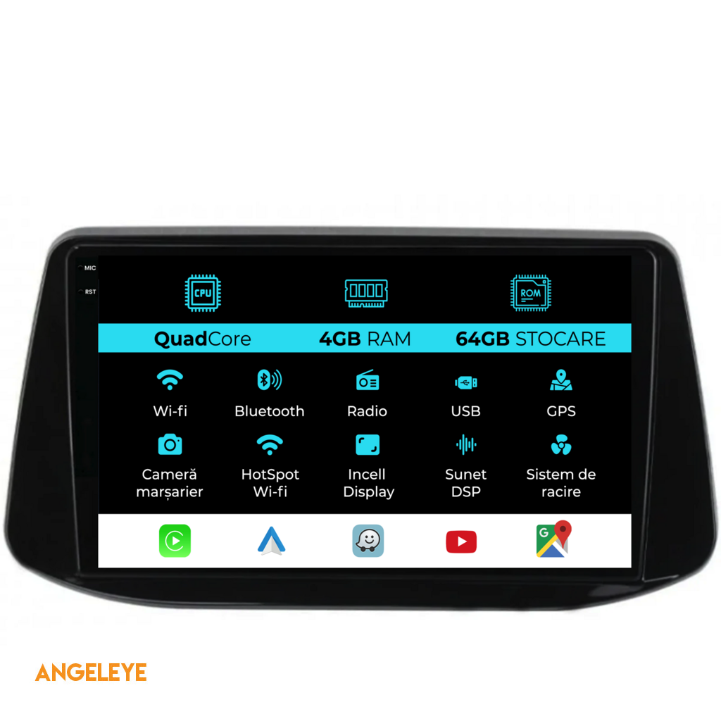 Sistem de operare: Android 13 Procesor: Quad-core 1.5Ghz Memorie RAM: 4GB Stocare interna (ROM): 64GB Dimensiune Display: 9 Inch Rezolutie ecran: 1360x800p Bluetooth: Bluetooth pentru apeluri, descarcare agenda telefonica si redare muzica WiFi: Da (Integrat) Slot Sim 4G: Nu Conectivitate retea: Hotspot telefon, router extern, dongle 3G sau 4G, CarPlay Android Auto Microfon: Microfon integrat, cu posibilitate de conectare microfon extern Alimentare: 12V Putere audio: 4x45W Egalizator DSP: Procesor de sunet digital (DSP EQ) Compatibilitate USB SD: Compatibil cu USB de pana la 128GB, suport SD prin adaptor USB Compatibilitate aplicatii Android: Compatibil cu majoritatea aplicatiilor Android din Google Play Compatibilitate CarPlay si Android Auto: Da, compatibil cu iOS (CarPlay) si Android (Android Auto) Suport pentru limbi Romana, Engleza, Maghiara, Spaniola, Italiana, Germana, etc. Tip ecran: TouchScreen capacitiv, multi-touch, IPS Setari luminozitate: Da Radio RDS: Da Iesire subwoofer RCA: Da Iesire video RCA: Da, cu ajutorul unui adaptor USB Iesire audio RCA: Da GPS: Da, (Google Maps, Waze, HereWeGo) Senzori de parcare: Da (Preluare senzori de parcare cu afisaj unde este cazul) Control volan: Da (Preluare comenzi volan cu canbus sau analogic unde este cazul) Compatibilitate camera DVR: Da Compatibilitate camera marsarier: Da Manual de utilizare: Da Continut pachet: Navigatie Android Rama adaptoare Cablaj de alimentare Antena GPS Conectori RCA Cablaj pentru camera de marsarier, 2 cabluri USB Canbus (doar daca este cazul) Certificat de garantie Factura fiscala Navigatia este compatibila cu urmatoarele marci auto : Hyundai : I30 (2017-2022)