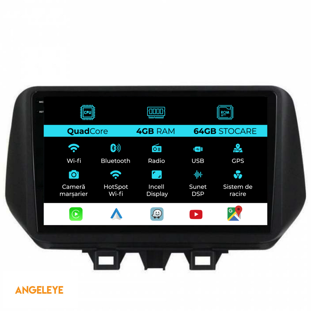 Sistem de operare: Android 13 Procesor: Quad-core 1.5Ghz Memorie RAM: 4GB Stocare interna (ROM): 64GB Dimensiune Display: 9 Inch Rezolutie ecran: 1360x800p Bluetooth: Bluetooth pentru apeluri, descarcare agenda telefonica si redare muzica WiFi: Da (Integrat) Slot Sim 4G: Nu Conectivitate retea: Hotspot telefon, router extern, dongle 3G sau 4G, CarPlay Android Auto Microfon: Microfon integrat, cu posibilitate de conectare microfon extern Alimentare: 12V Putere audio: 4x45W Egalizator DSP: Procesor de sunet digital (DSP EQ) Compatibilitate USB SD: Compatibil cu USB de pana la 128GB, suport SD prin adaptor USB Compatibilitate aplicatii Android: Compatibil cu majoritatea aplicatiilor Android din Google Play Compatibilitate CarPlay si Android Auto: Da, compatibil cu iOS (CarPlay) si Android (Android Auto) Suport pentru limbi Romana, Engleza, Maghiara, Spaniola, Italiana, Germana, etc. Tip ecran: TouchScreen capacitiv, multi-touch, IPS Setari luminozitate: Da Radio RDS: Da Iesire subwoofer RCA: Da Iesire video RCA: Da, cu ajutorul unui adaptor USB Iesire audio RCA: Da GPS: Da, (Google Maps, Waze, HereWeGo) Senzori de parcare: Da (Preluare senzori de parcare cu afisaj unde este cazul) Control volan: Da (Preluare comenzi volan cu canbus sau analogic unde este cazul) Compatibilitate camera DVR: Da Compatibilitate camera marsarier: Da Manual de utilizare: Da Continut pachet: Navigatie Android Rama adaptoare Cablaj de alimentare Antena GPS Conectori RCA Cablaj pentru camera de marsarier, 2 cabluri USB Canbus (doar daca este cazul) Certificat de garantie Factura fiscala Navigatia este compatibila cu urmatoarele marci auto : Hyundai : Tucson (2018-2020)