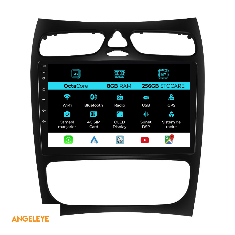 Sistem de operare: Android 13 Procesor: Octa-core 2,0Ghz Memorie RAM: 8GB Stocare interna (ROM): 256GB Dimensiune Display: 9 Inch Rezolutie ecran: 1280x720p Bluetooth: Bluetooth pentru apeluri, descarcare agenda telefonica si redare muzica WiFi: Da (Integrat) Slot Sim 4G: Da Conectivitate retea: 4G, Hotspot telefon, router extern, dongle 3G sau 4G, CarPlay Android Auto Microfon: Microfon integrat, cu posibilitate de conectare microfon extern Alimentare: 12V Putere audio: 4x45W Egalizator DSP: Procesor de sunet digital (DSP EQ) Compatibilitate USB SD: Compatibil cu USB de pana la 128GB, suport SD prin adaptor USB Compatibilitate aplicatii Android: Compatibil cu majoritatea aplicatiilor Android din Google Play Compatibilitate CarPlay si Android Auto: Da, compatibil cu iOS (CarPlay) si Android (Android Auto) Suport pentru limbi:a Romana, Engleza, Maghiara, Spaniola, Italiana, Germana, etc. Tip ecran: TouchScreen capacitiv, multi-touch, IPS Setari luminozitate: Da Radio RDS: Da Iesire subwoofer RCA: Da Iesire video RCA: Da, cu ajutorul unui adaptor USB Iesire audio RCA: Da GPS: Da, (Google Maps, Waze, HereWeGo) Senzori de parcare: Da (Preluare senzori de parcare cu afisaj unde este cazul) Control volan: Da (Preluare comenzi volan cu canbus sau analogic unde este cazul) Compatibilitate camera DVR: Da Compatibilitate camera marsarier: Da Manual de utilizare: Da Continut pachet: Navigatie Android Rama adaptoare Cablaj de alimentare Antena GPS Antena 4G Conectori RCA Cablaj pentru camera de marsarier, 2 cabluri USB Canbus (doar daca este cazul) Certificat de garantie Factura fiscala Navigatia este compatibila cu urmatoarele marci auto : Mercedes Benz: C-Class W203 (2000 - 2005) CLK W209 (1998 - 2005)