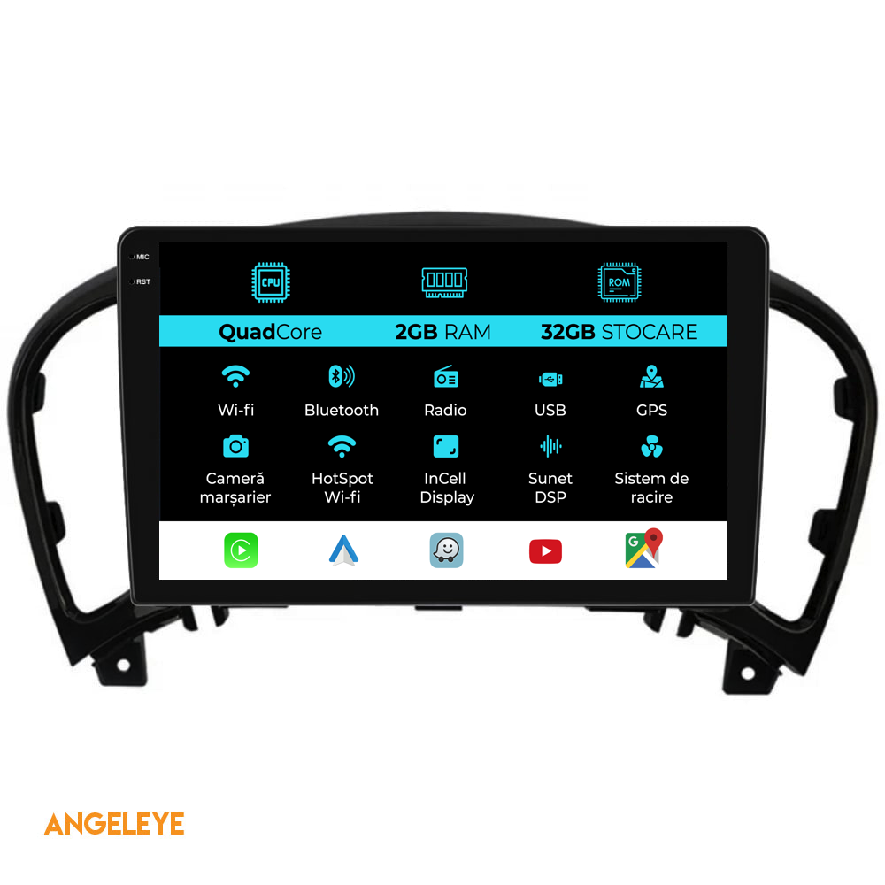 Sistem de operare: Android 13 Procesor: Quadcore Memorie RAM: 2GB Stocare interna (ROM): 32GB Dimensiune Display: 9 Inch Rezolutie ecran: 1360x800p Bluetooth: Bluetooth pentru apeluri, descarcare agenda telefonica si redare muzica WiFi: Da (Integrat) Slot Sim 4G: Nu Conectivitate retea: Hotspot telefon, router extern, dongle 3G sau 4G, CarPlay Android Auto Microfon: Microfon integrat, cu posibilitate de conectare microfon extern Alimentare: 12V Putere audio: 4x45W Egalizator DSP: Procesor de sunet digital (DSP EQ) Compatibilitate USB SD: Compatibil cu USB de pana la 128GB, suport SD prin adaptor USB Compatibilitate aplicatii Android: Compatibil cu majoritatea aplicatiilor Android din Google Play Compatibilitate CarPlay si Android Auto: Da, compatibil cu iOS (CarPlay) si Android (Android Auto) Suport pentru limbi Romana, Engleza, Maghiara, Spaniola, Italiana, Germana, etc. Tip ecran: TouchScreen capacitiv, multi-touch, IPS Setari luminozitate: Da Radio RDS: Da Iesire subwoofer RCA: Da Iesire video RCA: Da, cu ajutorul unui adaptor USB Iesire audio RCA: Da GPS: Da, (Google Maps, Waze, HereWeGo) Senzori de parcare: Da (Preluare senzori de parcare cu afisaj unde este cazul) Control volan: Da (Preluare comenzi volan cu canbus sau analogic unde este cazul) Compatibilitate camera DVR: Da Compatibilitate camera marsarier: Da Manual de utilizare: Da Continut pachet: Navigatie Android Rama adaptoare Cablaj de alimentare Antena GPS Conectori RCA Cablaj pentru camera de marsarier, 2 cabluri USB Canbus (doar daca este cazul) Certificat de garantie Factura fiscala Navigatia este compatibila cu urmatoarele marci auto : Nissan: Juke (2010-2017)