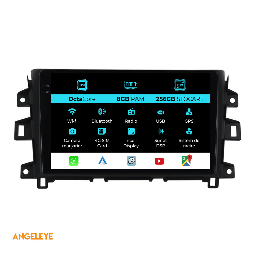 Sistem de operare: Android 13 Procesor: Octa-core 1.8Ghz Memorie RAM: 8GB Stocare interna (ROM): 256GB Dimensiune Display: 10 Inch Rezolutie ecran: 1280x800p Bluetooth: Bluetooth pentru apeluri, descarcare agenda telefonica si redare muzica WiFi: Da (Integrat) Slot Sim 4G: Da Conectivitate retea: 4G, Hotspot telefon, router extern, dongle 3G sau 4G, CarPlay Android Auto Microfon: Microfon integrat, cu posibilitate de conectare microfon extern Alimentare: 12V Putere audio: 4x45W Egalizator DSP: Procesor de sunet digital (DSP EQ) Compatibilitate USB SD: Compatibil cu USB de pana la 128GB, suport SD prin adaptor USB Compatibilitate aplicatii Android: Compatibil cu majoritatea aplicatiilor Android din Google Play Compatibilitate CarPlay si Android Auto: Da, compatibil cu iOS (CarPlay) si Android (Android Auto) Suport pentru limbi:a Romana, Engleza, Maghiara, Spaniola, Italiana, Germana, etc. Tip ecran: TouchScreen capacitiv, multi-touch, IPS Setari luminozitate: Da Radio RDS: Da Iesire subwoofer RCA: Da Iesire video RCA: Da, cu ajutorul unui adaptor USB Iesire audio RCA: Da GPS: Da, (Google Maps, Waze, HereWeGo) Senzori de parcare: Da (Preluare senzori de parcare cu afisaj unde este cazul) Control volan: Da (Preluare comenzi volan cu canbus sau analogic unde este cazul) Compatibilitate camera DVR: Da Compatibilitate camera marsarier: Da Manual de utilizare: Da Continut pachet: Navigatie Android Rama adaptoare Cablaj de alimentare Antena GPS Antena 4G Conectori RCA Cablaj pentru camera de marsarier, 2 cabluri USB Canbus (doar daca este cazul) Certificat de garantie Factura fiscala Navigatia este compatibila cu urmatoarele marci auto : Nissan : Navara (2015-2022)