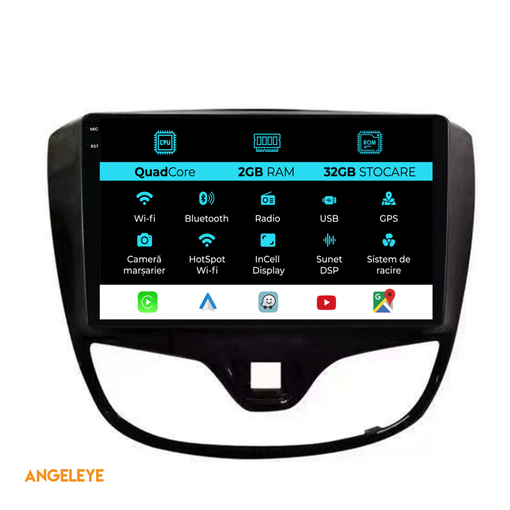 Sistem de operare: Android 13 Procesor: Quadcore Memorie RAM: 2GB Stocare interna (ROM): 32GB Dimensiune Display: 9 Inch Rezolutie ecran: 1360x800p Bluetooth: Bluetooth pentru apeluri, descarcare agenda telefonica si redare muzica WiFi: Da (Integrat) Slot Sim 4G: Nu Conectivitate retea: Hotspot telefon, router extern, dongle 3G sau 4G, CarPlay Android Auto Microfon: Microfon integrat, cu posibilitate de conectare microfon extern Alimentare: 12V Putere audio: 4x45W Egalizator DSP: Procesor de sunet digital (DSP EQ) Compatibilitate USB SD: Compatibil cu USB de pana la 128GB, suport SD prin adaptor USB Compatibilitate aplicatii Android: Compatibil cu majoritatea aplicatiilor Android din Google Play Compatibilitate CarPlay si Android Auto: Da, compatibil cu iOS (CarPlay) si Android (Android Auto) Suport pentru limbi:a Romana, Engleza, Maghiara, Spaniola, Italiana, Germana, etc. Tip ecran: TouchScreen capacitiv, multi-touch, IPS Setari luminozitate: Da Radio RDS: Da Iesire subwoofer RCA: Da Iesire video RCA: Da, cu ajutorul unui adaptor USB Iesire audio RCA: Da GPS: Da, (Google Maps, Waze, HereWeGo) Senzori de parcare: Da (Preluare senzori de parcare cu afisaj unde este cazul) Control volan: Da (Preluare comenzi volan cu canbus sau analogic unde este cazul) Compatibilitate camera DVR: Da Compatibilitate camera marsarier: Da Manual de utilizare: Da Continut pachet: Navigatie Android Rama adaptoare Cablaj de alimentare Antena GPS Conectori RCA Cablaj pentru camera de marsarier, 2 cabluri USB Canbus (doar daca este cazul) Certificat de garantie Factura fiscala Navigatia este compatibila cu urmatoarele marci auto : Opel : Karl (2015 - 2019)