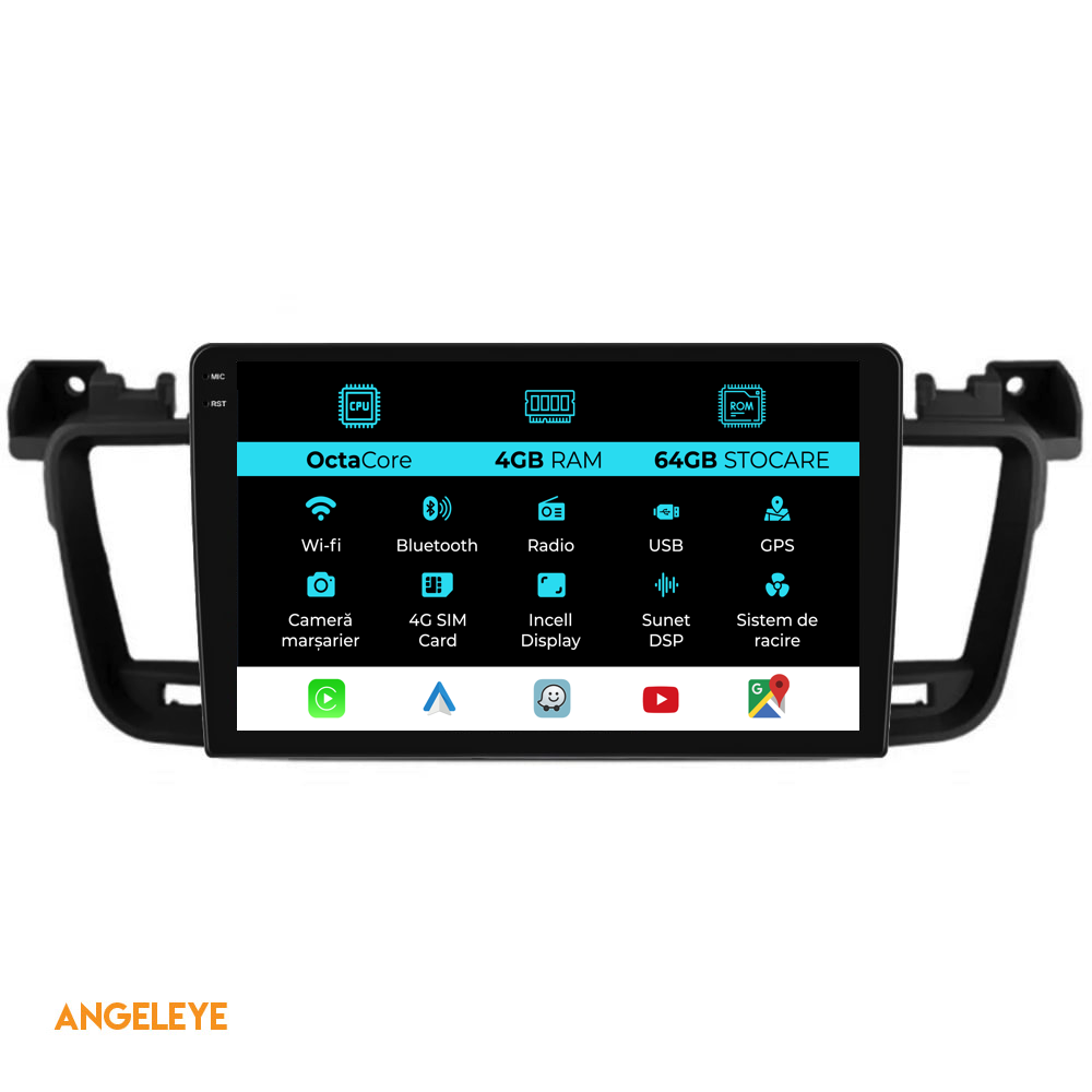 Sistem de operare: Android 13 Procesor: Octa-core Memorie RAM: 4GB Stocare interna (ROM): 64GB Dimensiune Display: 9 Inch Rezolutie ecran: 1360x800p Bluetooth: Bluetooth pentru apeluri, descarcare agenda telefonica si redare muzica WiFi: Da (Integrat) Slot Sim 4G: Da Conectivitate retea: 4G, Hotspot telefon, router extern, dongle 3G sau 4G, CarPlay Android Auto Microfon: Microfon integrat, cu posibilitate de conectare microfon extern Alimentare: 12V Putere audio: 4x45W Egalizator DSP: Procesor de sunet digital (DSP EQ) Compatibilitate USB SD: Compatibil cu USB de pana la 128GB, suport SD prin adaptor USB Compatibilitate aplicatii Android: Compatibil cu majoritatea aplicatiilor Android din Google Play Compatibilitate CarPlay si Android Auto: Da, compatibil cu iOS (CarPlay) si Android (Android Auto) Suport pentru limbi Romana, Engleza, Maghiara, Spaniola, Italiana, Germana, etc. Tip ecran: TouchScreen capacitiv, multi-touch, IPS Setari luminozitate: Da Radio RDS: Da Iesire subwoofer RCA: Da Iesire video RCA: Da, cu ajutorul unui adaptor USB Iesire audio RCA: Da GPS: Da, (Google Maps, Waze, HereWeGo) Senzori de parcare: Da (Preluare senzori de parcare cu afisaj unde este cazul) Control volan: Da (Preluare comenzi volan cu canbus sau analogic unde este cazul) Compatibilitate camera DVR: Da Compatibilitate camera marsarier: Da Manual de utilizare: Da Continut pachet: Navigatie Android Rama adaptoare Cablaj de alimentare Antena GPS Antena 4G Conectori RCA Cablaj pentru camera de marsarier, 2 cabluri USB Canbus (doar daca este cazul) Certificat de garantie Factura fiscala Navigatia este compatibila cu urmatoarele marci auto : Peugeot: 508 (2010-2018)