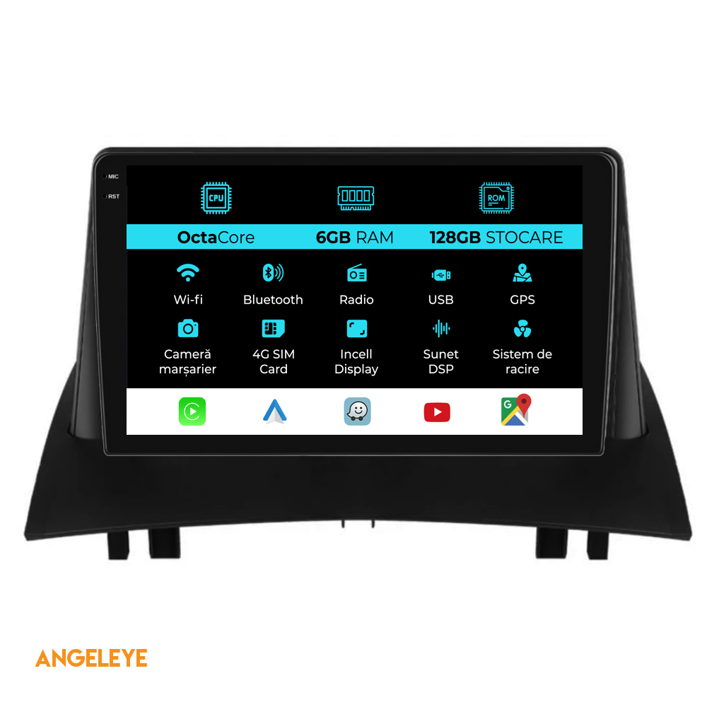 Sistem de operare: Android 13 Procesor: Octa-core 1.6Ghz Memorie RAM: 6GB Stocare interna (ROM): 128GB Dimensiune Display: 9 Inch Rezolutie ecran: 1360x800p Bluetooth: Bluetooth pentru apeluri, descarcare agenda telefonica si redare muzica WiFi: Da (Integrat) Slot Sim 4G: Da Conectivitate retea: 4G, Hotspot telefon, router extern, dongle 3G sau 4G, CarPlay Android Auto Microfon: Microfon integrat, cu posibilitate de conectare microfon extern Alimentare: 12V Putere audio: 4x45W Egalizator DSP: Procesor de sunet digital (DSP EQ) Compatibilitate USB SD: Compatibil cu USB de pana la 128GB, suport SD prin adaptor USB Compatibilitate aplicatii Android: Compatibil cu majoritatea aplicatiilor Android din Google Play Compatibilitate CarPlay si Android Auto: Da, compatibil cu iOS (CarPlay) si Android (Android Auto) Suport pentru limbi Romana, Engleza, Maghiara, Spaniola, Italiana, Germana, etc. Tip ecran: TouchScreen capacitiv, multi-touch, IPS Setari luminozitate: Da Radio RDS: Da Iesire subwoofer RCA: Da Iesire video RCA: Da, cu ajutorul unui adaptor USB Iesire audio RCA: Da GPS: Da, (Google Maps, Waze, HereWeGo) Senzori de parcare: Da (Preluare senzori de parcare cu afisaj unde este cazul) Control volan: Da (Preluare comenzi volan cu canbus sau analogic unde este cazul) Compatibilitate camera DVR: Da Compatibilitate camera marsarier: Da Manual de utilizare: Da Continut pachet: Navigatie Android Rama adaptoare Cablaj de alimentare Antena GPS Antena 4G Conectori RCA Cablaj pentru camera de marsarier, 2 cabluri USB Canbus (doar daca este cazul) Certificat de garantie Factura fiscala Navigatia este compatibila cu urmatoarele marci auto : Renault: Megane 2 (2002 - 2009)