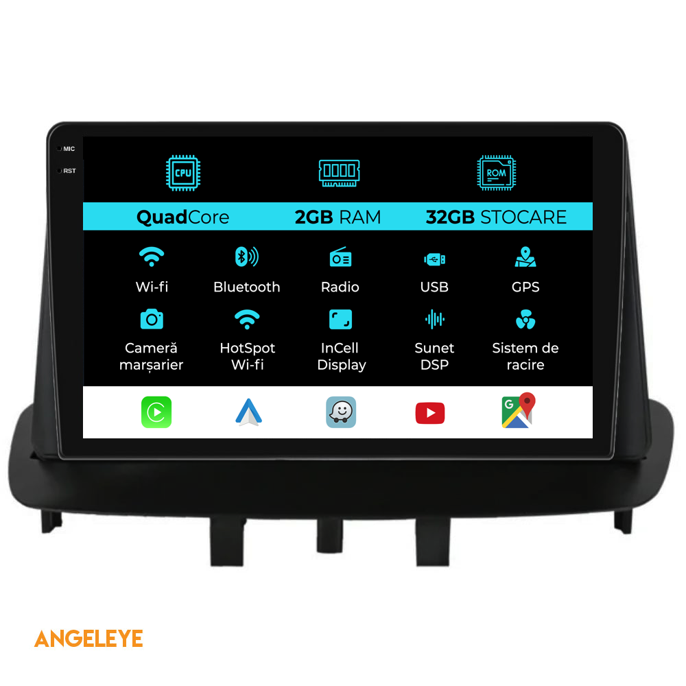 Sistem de operare: Android 13 Procesor: Quadcore Memorie RAM: 2GB Stocare interna (ROM): 32GB Dimensiune Display: 9 Inch Rezolutie ecran: 1360x800p Bluetooth: Bluetooth pentru apeluri, descarcare agenda telefonica si redare muzica WiFi: Da (Integrat) Slot Sim 4G: Nu Conectivitate retea: Hotspot telefon, router extern, dongle 3G sau 4G, CarPlay Android Auto Microfon: Microfon integrat, cu posibilitate de conectare microfon extern Alimentare: 12V Putere audio: 4x45W Egalizator DSP: Procesor de sunet digital (DSP EQ) Compatibilitate USB SD: Compatibil cu USB de pana la 128GB, suport SD prin adaptor USB Compatibilitate aplicatii Android: Compatibil cu majoritatea aplicatiilor Android din Google Play Compatibilitate CarPlay si Android Auto: Da, compatibil cu iOS (CarPlay) si Android (Android Auto) Suport pentru limbi Romana, Engleza, Maghiara, Spaniola, Italiana, Germana, etc. Tip ecran: TouchScreen capacitiv, multi-touch, IPS Setari luminozitate: Da Radio RDS: Da Iesire subwoofer RCA: Da Iesire video RCA: Da, cu ajutorul unui adaptor USB Iesire audio RCA: Da GPS: Da, (Google Maps, Waze, HereWeGo) Senzori de parcare: Da (Preluare senzori de parcare cu afisaj unde este cazul) Control volan: Da (Preluare comenzi volan cu canbus sau analogic unde este cazul) Compatibilitate camera DVR: Da Compatibilitate camera marsarier: Da Manual de utilizare: Da Continut pachet: Navigatie Android Rama adaptoare Cablaj de alimentare Antena GPS Conectori RCA Cablaj pentru camera de marsarier, 2 cabluri USB Canbus (doar daca este cazul) Certificat de garantie Factura fiscala Navigatia este compatibila cu urmatoarele marci auto : Renault: Megane 3 (2008 - 2015) Fluence (2008 - 2015)
