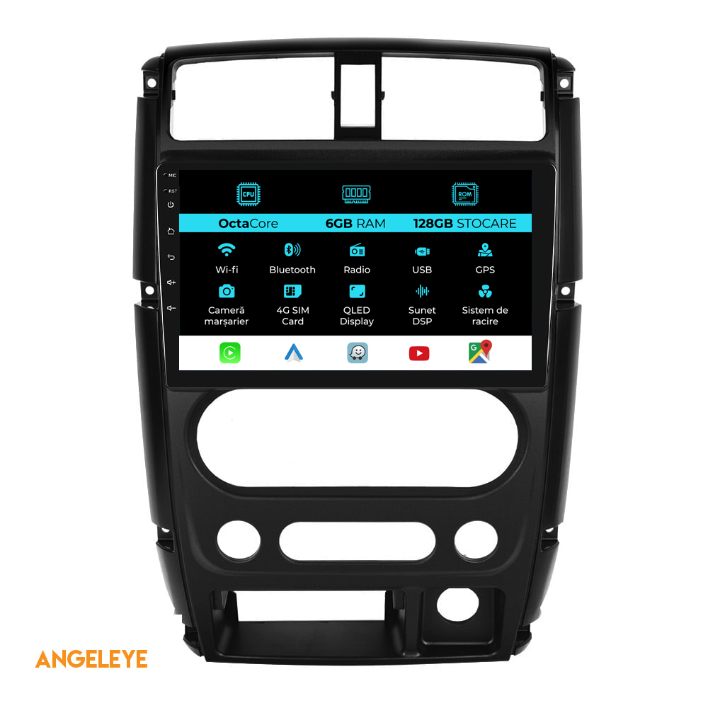 Sistem de operare: Android 13 Procesor: Octa-core 1,8Ghz Memorie RAM: 6GB Stocare interna (ROM): 128GB Dimensiune Display: 9 Inch Rezolutie ecran: 1280x720p Bluetooth: Bluetooth pentru apeluri, descarcare agenda telefonica si redare muzica WiFi: Da (Integrat) Slot Sim 4G: Da Conectivitate retea: 4G, Hotspot telefon, router extern, dongle 3G sau 4G, CarPlay Android Auto Microfon: Microfon integrat, cu posibilitate de conectare microfon extern Alimentare: 12V Putere audio: 4x45W Egalizator DSP: Procesor de sunet digital (DSP EQ) Compatibilitate USB SD: Compatibil cu USB de pana la 128GB, suport SD prin adaptor USB Compatibilitate aplicatii Android: Compatibil cu majoritatea aplicatiilor Android din Google Play Compatibilitate CarPlay si Android Auto: Da, compatibil cu iOS (CarPlay) si Android (Android Auto) Suport pentru limbi:a Romana, Engleza, Maghiara, Spaniola, Italiana, Germana, etc. Tip ecran: TouchScreen capacitiv, multi-touch, IPS Setari luminozitate: Da Radio RDS: Da Iesire subwoofer RCA: Da Iesire video RCA: Da, cu ajutorul unui adaptor USB Iesire audio RCA: Da GPS: Da, (Google Maps, Waze, HereWeGo) Senzori de parcare: Da (Preluare senzori de parcare cu afisaj unde este cazul) Control volan: Da (Preluare comenzi volan cu canbus sau analogic unde este cazul) Compatibilitate camera DVR: Da Compatibilitate camera marsarier: Da Manual de utilizare: Da Continut pachet: Navigatie Android Rama adaptoare Cablaj de alimentare Antena GPS Antena 4G Conectori RCA Cablaj pentru camera de marsarier, 2 cabluri USB Canbus (doar daca este cazul) Certificat de garantie Factura fiscala Navigatia este compatibila cu urmatoarele marci auto : Suzuki: Jimny 3 (2005 - 2019)