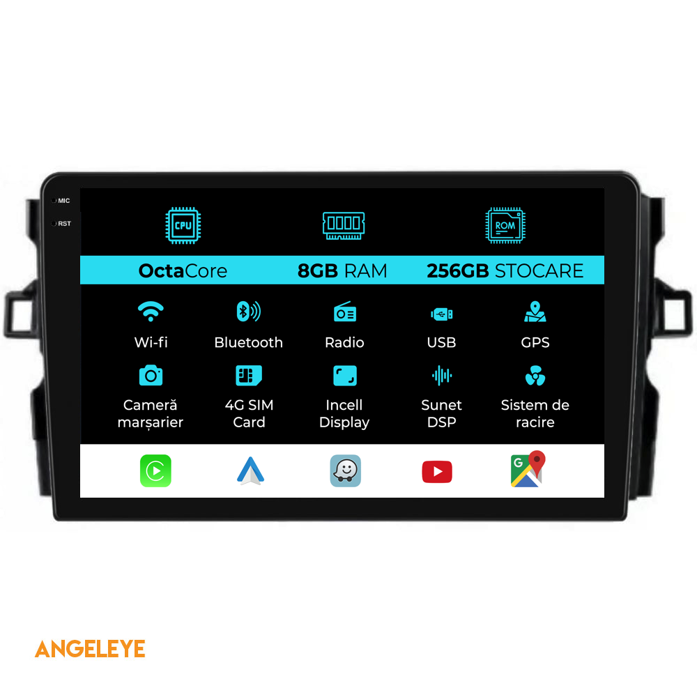 Sistem de operare: Android 13 Procesor: Octa-core 1.8Ghz Memorie RAM: 8GB Stocare interna (ROM): 256GB Dimensiune Display: 10 Inch Rezolutie ecran: 1280x800p Bluetooth: Bluetooth pentru apeluri, descarcare agenda telefonica si redare muzica WiFi: Da (Integrat) Slot Sim 4G: Da Conectivitate retea: 4G, Hotspot telefon, router extern, dongle 3G sau 4G, CarPlay Android Auto Microfon: Microfon integrat, cu posibilitate de conectare microfon extern Alimentare: 12V Putere audio: 4x45W Egalizator DSP: Procesor de sunet digital (DSP EQ) Compatibilitate USB SD: Compatibil cu USB de pana la 128GB, suport SD prin adaptor USB Compatibilitate aplicatii Android: Compatibil cu majoritatea aplicatiilor Android din Google Play Compatibilitate CarPlay si Android Auto: Da, compatibil cu iOS (CarPlay) si Android (Android Auto) Suport pentru limbi:a Romana, Engleza, Maghiara, Spaniola, Italiana, Germana, etc. Tip ecran: TouchScreen capacitiv, multi-touch, IPS Setari luminozitate: Da Radio RDS: Da Iesire subwoofer RCA: Da Iesire video RCA: Da, cu ajutorul unui adaptor USB Iesire audio RCA: Da GPS: Da, (Google Maps, Waze, HereWeGo) Senzori de parcare: Da (Preluare senzori de parcare cu afisaj unde este cazul) Control volan: Da (Preluare comenzi volan cu canbus sau analogic unde este cazul) Compatibilitate camera DVR: Da Compatibilitate camera marsarier: Da Manual de utilizare: Da Continut pachet: Navigatie Android Rama adaptoare Cablaj de alimentare Antena GPS Antena 4G Conectori RCA Cablaj pentru camera de marsarier, 2 cabluri USB Canbus (doar daca este cazul) Certificat de garantie Factura fiscala Navigatia este compatibila cu urmatoarele marci auto : Toyota : Auris (2006 - 2012)