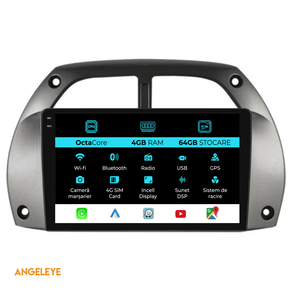 Sistem de operare: Android 13 Procesor: Octa-core Memorie RAM: 4GB Stocare interna (ROM): 64GB Dimensiune Display: 9 Inch Rezolutie ecran: 1360x800p Bluetooth: Bluetooth pentru apeluri, descarcare agenda telefonica si redare muzica WiFi: Da (Integrat) Slot Sim 4G: Da Conectivitate retea: 4G, Hotspot telefon, router extern, dongle 3G sau 4G, CarPlay Android Auto Microfon: Microfon integrat, cu posibilitate de conectare microfon extern Alimentare: 12V Putere audio: 4x45W Egalizator DSP: Procesor de sunet digital (DSP EQ) Compatibilitate USB SD: Compatibil cu USB de pana la 128GB, suport SD prin adaptor USB Compatibilitate aplicatii Android: Compatibil cu majoritatea aplicatiilor Android din Google Play Compatibilitate CarPlay si Android Auto: Da, compatibil cu iOS (CarPlay) si Android (Android Auto) Suport pentru limbi Romana, Engleza, Maghiara, Spaniola, Italiana, Germana, etc. Tip ecran: TouchScreen capacitiv, multi-touch, IPS Setari luminozitate: Da Radio RDS: Da Iesire subwoofer RCA: Da Iesire video RCA: Da, cu ajutorul unui adaptor USB Iesire audio RCA: Da GPS: Da, (Google Maps, Waze, HereWeGo) Senzori de parcare: Da (Preluare senzori de parcare cu afisaj unde este cazul) Control volan: Da (Preluare comenzi volan cu canbus sau analogic unde este cazul) Compatibilitate camera DVR: Da Compatibilitate camera marsarier: Da Manual de utilizare: Da Continut pachet: Navigatie Android Rama adaptoare Cablaj de alimentare Antena GPS Antena 4G Conectori RCA Cablaj pentru camera de marsarier, 2 cabluri USB Canbus (doar daca este cazul) Certificat de garantie Factura fiscala Navigatia este compatibila cu urmatoarele marci auto : Toyota: Rav 4 (2000 - 2005)