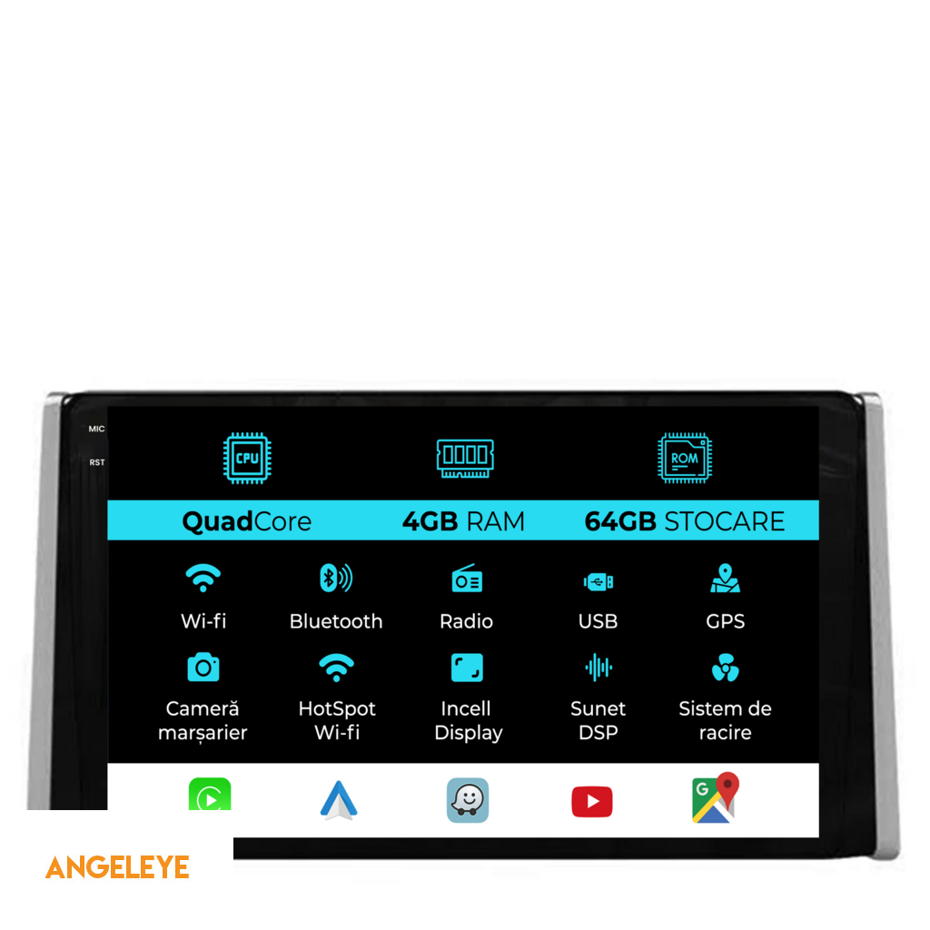 Sistem de operare: Android 13 Procesor: Quad-core 1.5Ghz Memorie RAM: 4GB Stocare interna (ROM): 64GB Dimensiune Display: 9 Inch Rezolutie ecran: 1360x800p Bluetooth: Bluetooth pentru apeluri, descarcare agenda telefonica si redare muzica WiFi: Da (Integrat) Slot Sim 4G: Nu Conectivitate retea: Hotspot telefon, router extern, dongle 3G sau 4G, CarPlay Android Auto Microfon: Microfon integrat, cu posibilitate de conectare microfon extern Alimentare: 12V Putere audio: 4x45W Egalizator DSP: Procesor de sunet digital (DSP EQ) Compatibilitate USB SD: Compatibil cu USB de pana la 128GB, suport SD prin adaptor USB Compatibilitate aplicatii Android: Compatibil cu majoritatea aplicatiilor Android din Google Play Compatibilitate CarPlay si Android Auto: Da, compatibil cu iOS (CarPlay) si Android (Android Auto) Suport pentru limbi Romana, Engleza, Maghiara, Spaniola, Italiana, Germana, etc. Tip ecran: TouchScreen capacitiv, multi-touch, IPS Setari luminozitate: Da Radio RDS: Da Iesire subwoofer RCA: Da Iesire video RCA: Da, cu ajutorul unui adaptor USB Iesire audio RCA: Da GPS: Da, (Google Maps, Waze, HereWeGo) Senzori de parcare: Da (Preluare senzori de parcare cu afisaj unde este cazul) Control volan: Da (Preluare comenzi volan cu canbus sau analogic unde este cazul) Compatibilitate camera DVR: Da Compatibilitate camera marsarier: Da Manual de utilizare: Da Continut pachet: Navigatie Android Rama adaptoare Cablaj de alimentare Antena GPS Conectori RCA Cablaj pentru camera de marsarier, 2 cabluri USB Canbus (doar daca este cazul) Certificat de garantie Factura fiscala Navigatia este compatibila cu urmatoarele marci auto : Toyota : Rav4 (2018-2024)