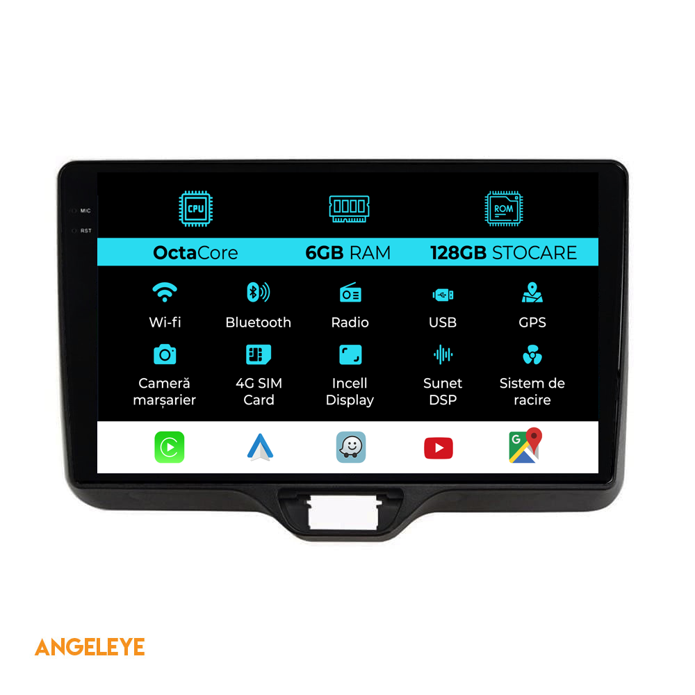 Sistem de operare: Android 13 Procesor: Octa-core 1.6Ghz Memorie RAM: 6GB Stocare interna (ROM): 128GB Dimensiune Display: 10 Inch Rezolutie ecran: 1280x800p Bluetooth: Bluetooth pentru apeluri, descarcare agenda telefonica si redare muzica WiFi: Da (Integrat) Slot Sim 4G: Da Conectivitate retea: 4G, Hotspot telefon, router extern, dongle 3G sau 4G, CarPlay Android Auto Microfon: Microfon integrat, cu posibilitate de conectare microfon extern Alimentare: 12V Putere audio: 4x45W Egalizator DSP: Procesor de sunet digital (DSP EQ) Compatibilitate USB SD: Compatibil cu USB de pana la 128GB, suport SD prin adaptor USB Compatibilitate aplicatii Android: Compatibil cu majoritatea aplicatiilor Android din Google Play Compatibilitate CarPlay si Android Auto: Da, compatibil cu iOS (CarPlay) si Android (Android Auto) Suport pentru limbi:a Romana, Engleza, Maghiara, Spaniola, Italiana, Germana, etc. Tip ecran: TouchScreen capacitiv, multi-touch, IPS Setari luminozitate: Da Radio RDS: Da Iesire subwoofer RCA: Da Iesire video RCA: Da, cu ajutorul unui adaptor USB Iesire audio RCA: Da GPS: Da, (Google Maps, Waze, HereWeGo) Senzori de parcare: Da (Preluare senzori de parcare cu afisaj unde este cazul) Control volan: Da (Preluare comenzi volan cu canbus sau analogic unde este cazul) Compatibilitate camera DVR: Da Compatibilitate camera marsarier: Da Manual de utilizare: Da Continut pachet: Navigatie Android Rama adaptoare Cablaj de alimentare Antena GPS Antena 4G Conectori RCA Cablaj pentru camera de marsarier, 2 cabluri USB Canbus (doar daca este cazul) Certificat de garantie Factura fiscala Navigatia este compatibila cu urmatoarele marci auto : Toyota : Yaris P21 (2020-2025)