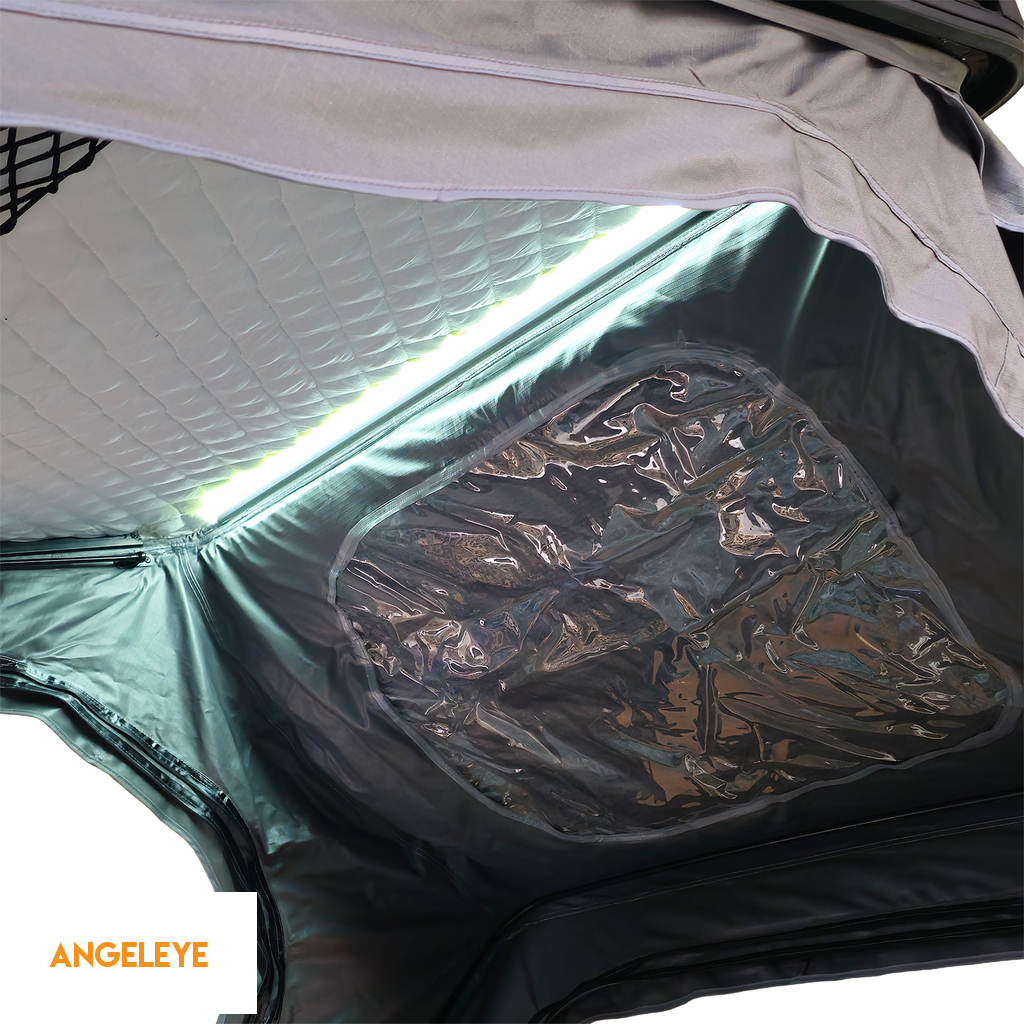 Sistemul de deschidere semi-automat cu arcuri cu gaz asigură o instalare și demontare rapidă, astfel încât cortul de pe acoperiș este gata de utilizare în doar câteva secunde. Carcasa aerodinamică măsoară aproximativ 210×130×17cm (L / l / H fără suport de acoperiș) când este închisă și impresionează prin calitatea extrem de rezistentă și impermeabilă RAMROXX®. În interior, cortul oferă un spațiu de dormit generos de aproximativ 130×200cm și o înălțime interioară de aproximativ 145cm – ideal pentru două persoane adulte și un copil.