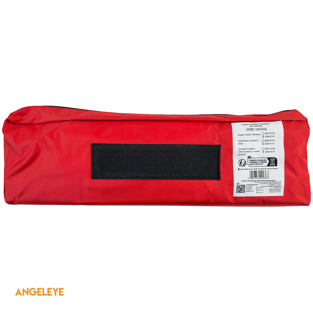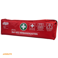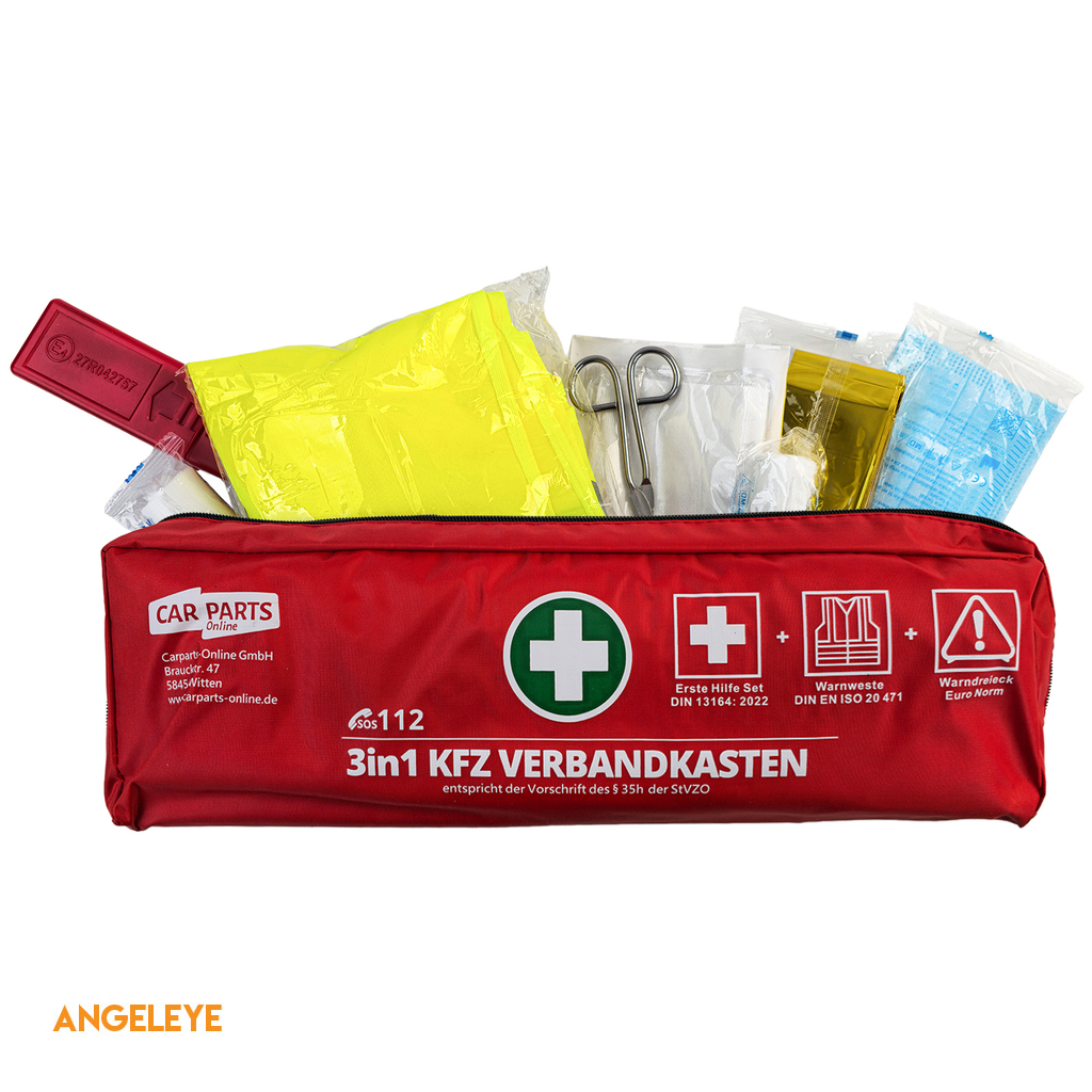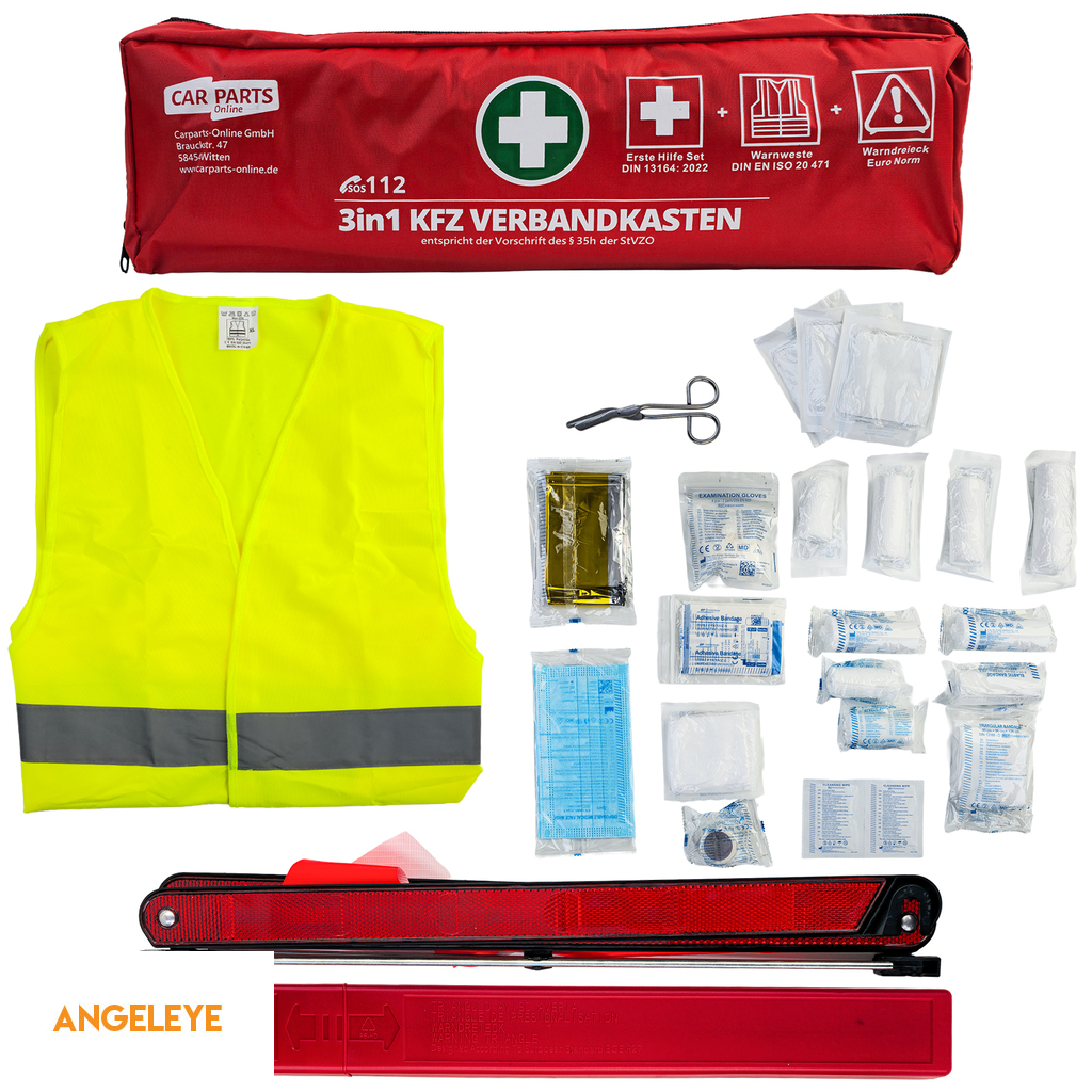 Kit de prim ajutor 3 în 1 pentru mașină – Prim ajutor DIN 13164 | Vestă de siguranță & Triunghi de avertizare | Roșu