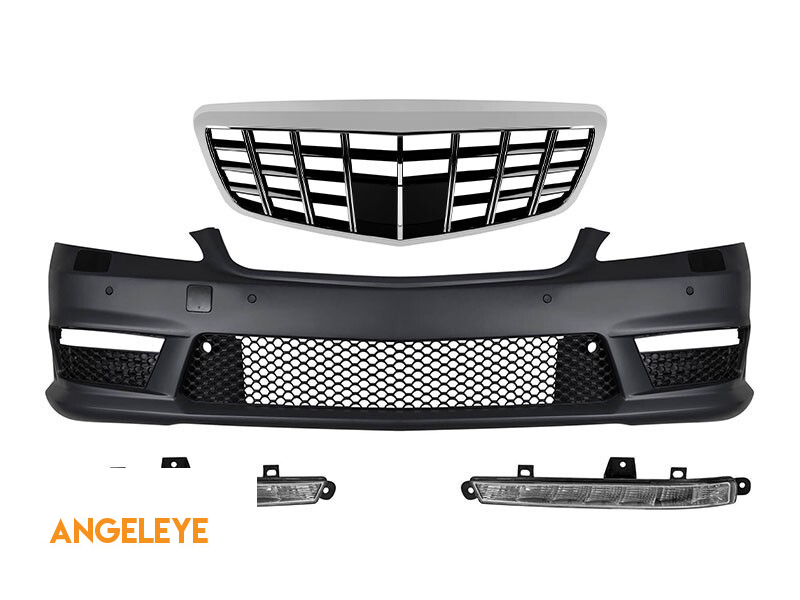 Bumper frontal A Design tip S63, S65 cu grilă Brabus crom/negru, potrivit pentru Mercedes S-Class W221 2006-2013 cu lumini de zi