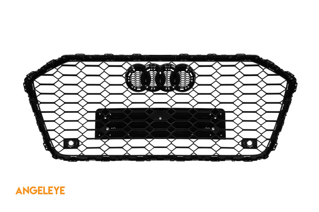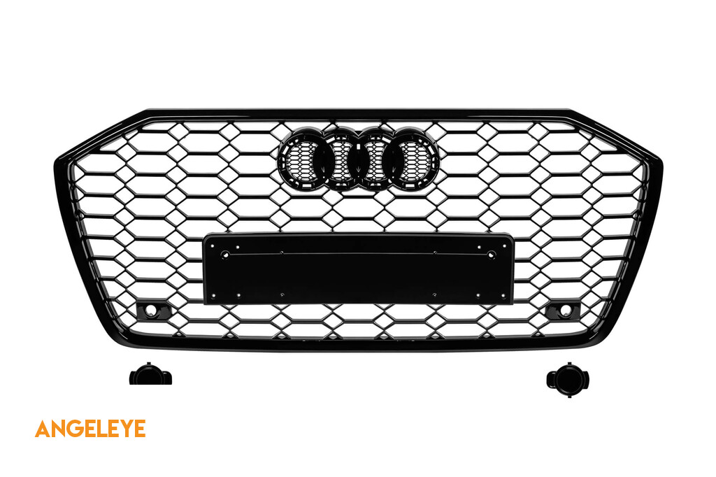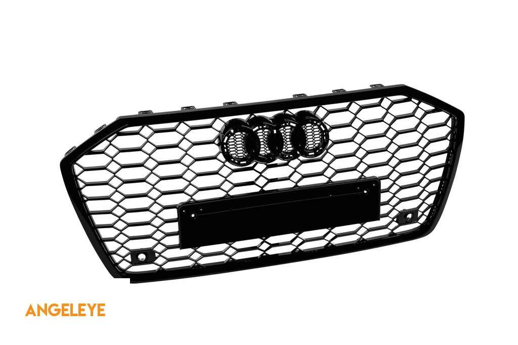 Grilă tip RS6 cu lac negru, potrivită pentru Audi A6 după 2018 pentru modelele echipate cu bara frontală standard sau S-line, cu bază pentru emblemă, cu deschideri pentru senzori de parcare.
