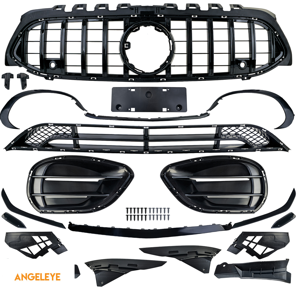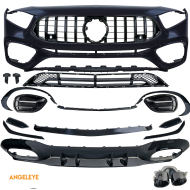 Setul cuprinzător include bara de protecție frontală în versiune sport, inclusiv inserții pentru bara de protecție, difuzorul posterior sport cu trimuri duble negre pentru țevi de evacuare și material de montaj, precum și grila radiatorului în stil GT-Sport. Toate componentele sunt fabricate din plastic ABS robust, precis realizat și sunt modelate în formă și execuție după designul sportiv original – ideal pentru o conversie sau o reparare de înaltă calitate.