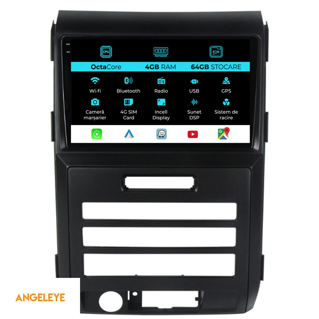Sistem de operare: Android 13 Procesor: Octa-core 1.8Ghz Memorie RAM: 4GB Stocare interna (ROM): 64GB Dimensiune Display: 9 Inch Rezolutie ecran: 1360x800p Bluetooth: Bluetooth pentru apeluri, descarcare agenda telefonica si redare muzica WiFi: Da (Integrat) Slot Sim 4G: Da Conectivitate retea: 4G, Hotspot telefon, router extern, dongle 3G sau 4G, CarPlay Android Auto Microfon: Microfon integrat, cu posibilitate de conectare microfon extern Alimentare: 12V Putere audio: 4x45W Egalizator DSP: Procesor de sunet digital (DSP EQ) Compatibilitate USB SD: Compatibil cu USB de pana la 128GB, suport SD prin adaptor USB Compatibilitate aplicatii Android: Compatibil cu majoritatea aplicatiilor Android din Google Play Compatibilitate CarPlay si Android Auto: Da, compatibil cu iOS (CarPlay) si Android (Android Auto) Suport pentru limbi:a Romana, Engleza, Maghiara, Spaniola, Italiana, Germana, etc. Tip ecran: TouchScreen capacitiv, multi-touch, IPS Setari luminozitate: Da Radio RDS: Da Iesire subwoofer RCA: Da Iesire video RCA: Da, cu ajutorul unui adaptor USB Iesire audio RCA: Da GPS: Da, (Google Maps, Waze, HereWeGo) Senzori de parcare: Da (Preluare senzori de parcare cu afisaj unde este cazul) Control volan: Da (Preluare comenzi volan cu canbus sau analogic unde este cazul) Compatibilitate camera DVR: Da Compatibilitate camera marsarier: Da Manual de utilizare: Da Continut pachet: Navigatie Android Rama adaptoare Cablaj de alimentare Antena GPS Antena 4G Conectori RCA Cablaj pentru camera de marsarier, 2 cabluri USB Canbus (doar daca este cazul) Certificat de garantie Factura fiscala Navigatia este compatibila cu urmatoarele marci auto : Ford F150 (2008-2014)